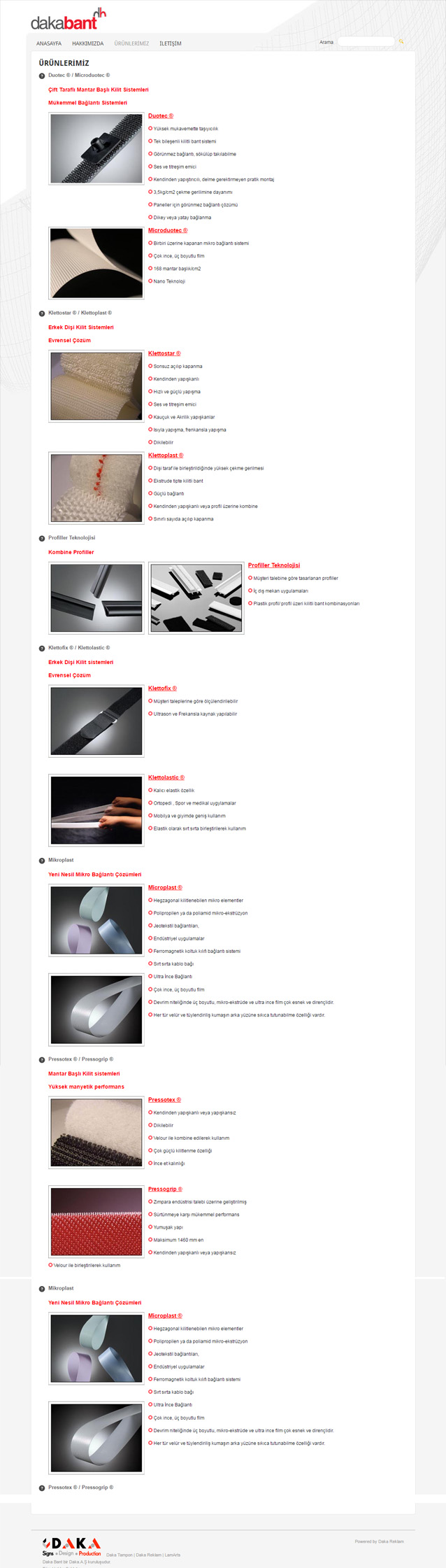 Daka AŞ. 1987 yılından bu yana görsel reklam, iç ve dış tanıtım, fuar stand organizasyonu, vitrin dekorasyonu ve müze ve diğer sergi alanları için baskı ve tefriş konularında hizmet vermektedir.